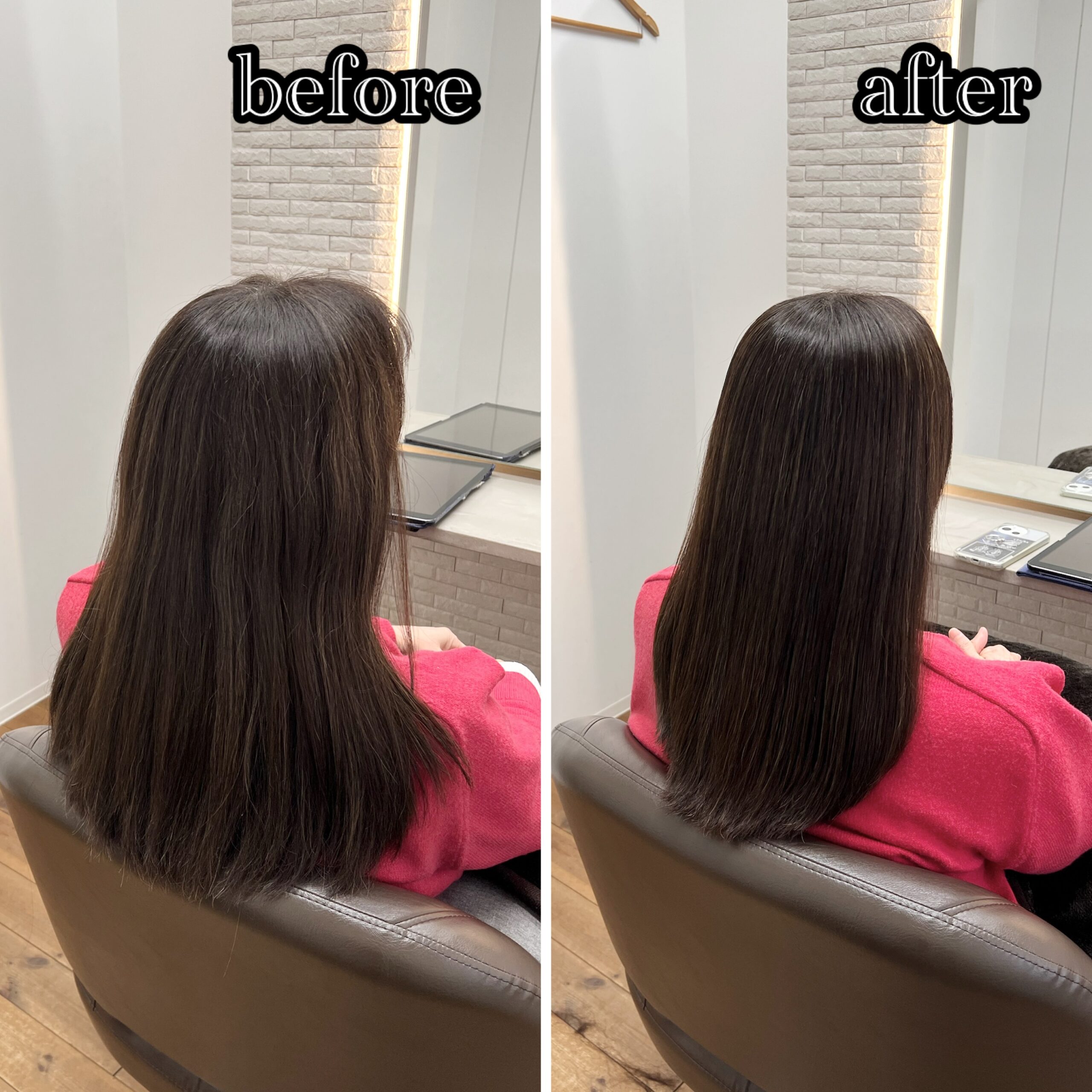 新潟店のブログ ストレートエステでタイトなスタイルに! dearsniigata 2026年2月1日 こちらのお客様はカラーや 縮毛矯正を繰り返し、 毛先のパサつきやダメージ まとまりがないというのがお悩みでした。 今回の髪の毛の悩みは薬剤の選定ミス、髪の毛の乾燥が重なって起きていました。 そこでディアーズでは優しい薬剤を使用して やさしい施術をさせて頂きました。 髪の毛に栄養をたくさん入れたり、 保湿をしっかりすることで まとまりのあるツヤ髪になりました。 お客様からは 「まとまりが出て嬉しいです」 と喜んで頂けました!