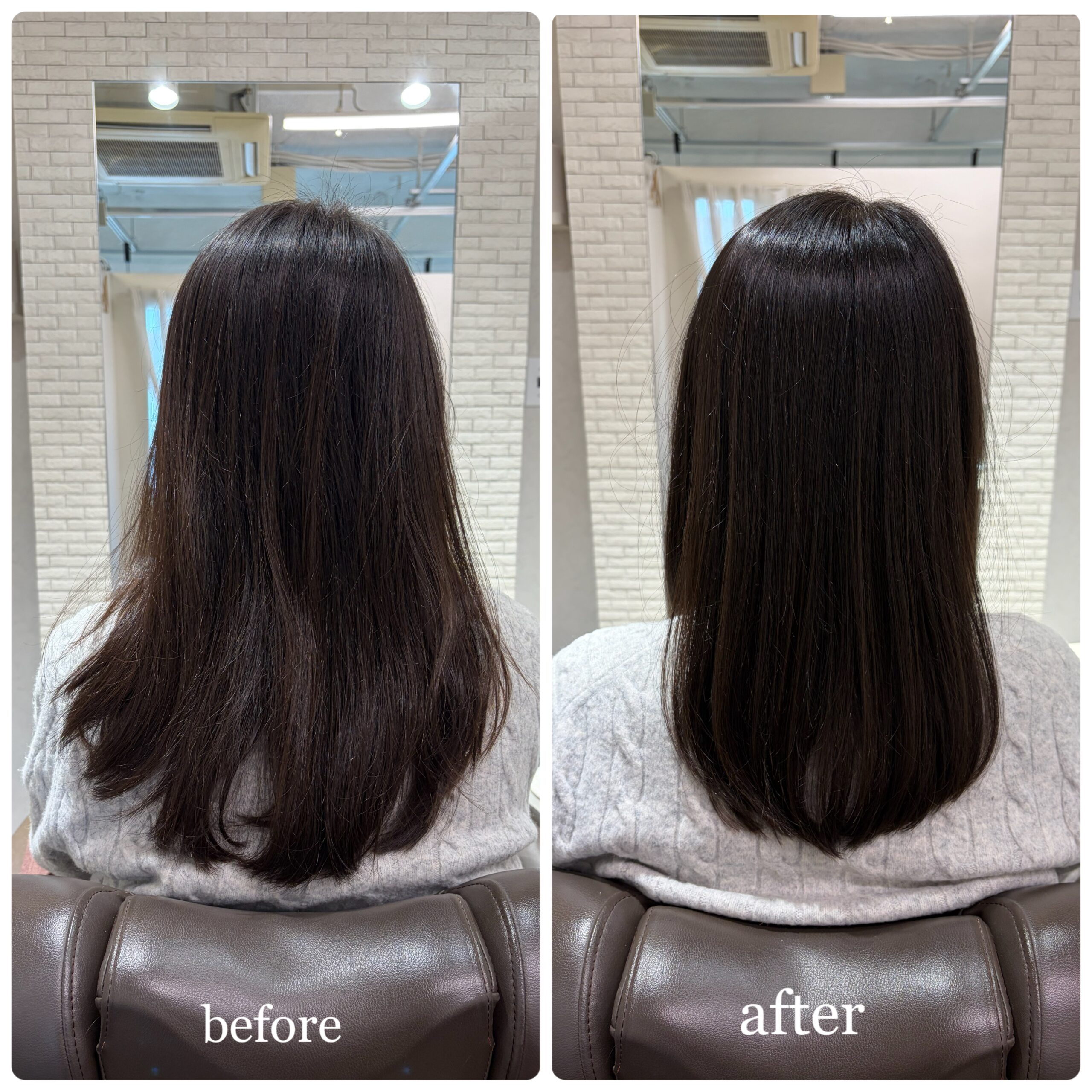 新潟店のトリートメントエステの施術実績 トリートメントエステで潤いチャージ dearsniigata 2026年2月19日 、 こちらのお客様はカラーや日々のアイロンによる毛先のパサつきやダメージで絡まり、まとまりがないというのがお悩みでした😭 今回の髪の毛の悩みは薬剤の選定ミス、 髪の毛の乾燥が重なって起きていました💦 そこでディアーズでは優しい薬剤を使用して やさしい施術をさせて頂きました☺️ 髪の毛に栄養をたくさん入れたり、 保湿をしっかりすることで まとまりのあるサラサラ髪になりました✨ お客様からは 「ツヤツヤで嬉しいです❣️」 と喜んで頂けました!