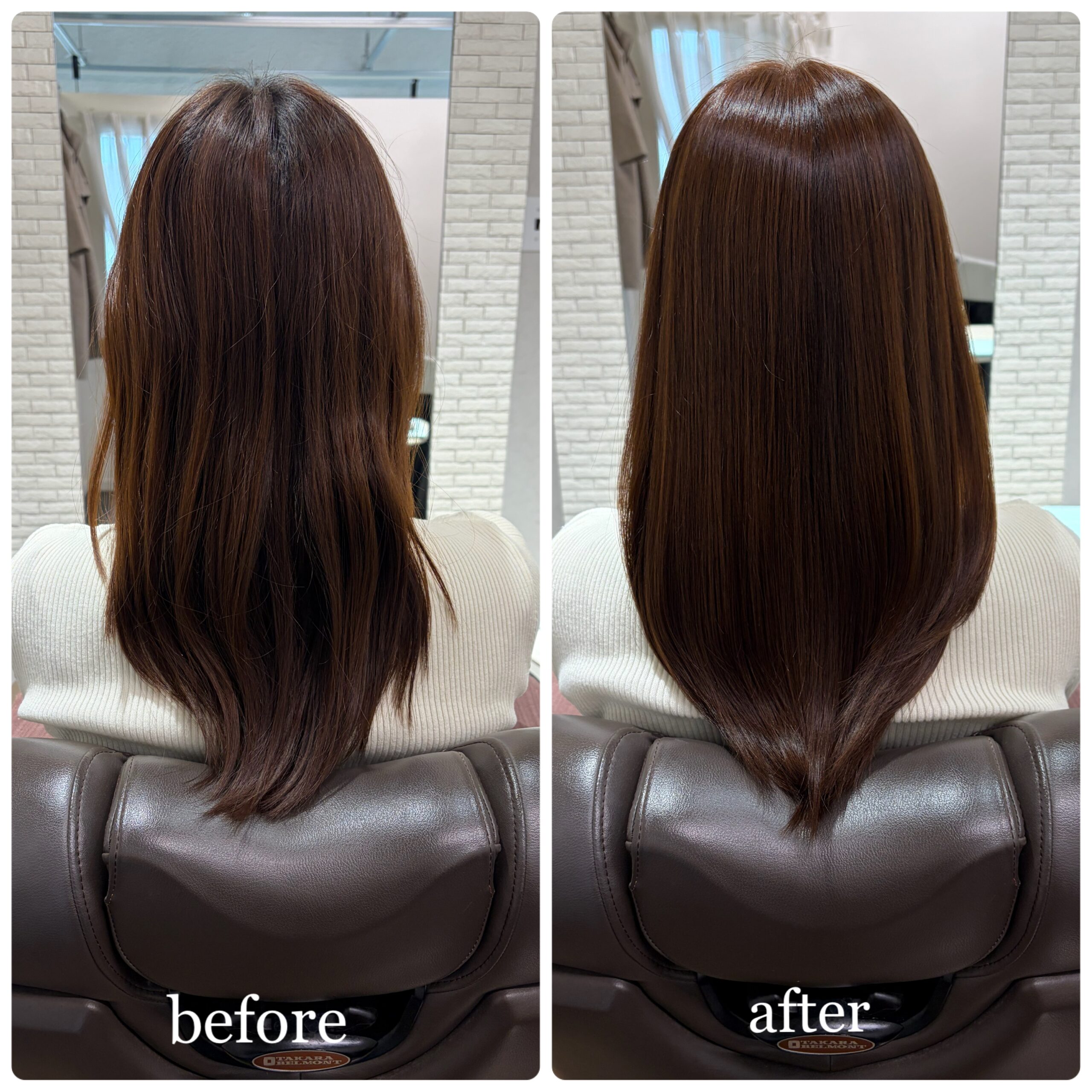 新潟店のカラーエステの施術実績 リタッチカラーエステで労わりながら艶々になりました♪ dearsniigata 2026年3月19日 こちらのお客様はカラーを繰り返し、毛先のパサつきやダメージで絡まり、まとまりがないというのがお悩みでした😭 今回の髪の毛の悩みは薬剤の選定ミス、 髪の毛の乾燥が重なって起きていました💦 そこでディアーズでは優しい薬剤を使用して やさしい施術をさせて頂きました☺️ 髪の毛に栄養をたくさん入れたり、 保湿をしっかりすることで まとまりのあるサラサラ髪になりました✨ お客様からは 「艶々になりました❣️」 と喜んで頂けました!