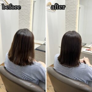 万代店のカラーエステの施術実績 カラーエステで綺麗な髪に dearsniigata 2025年9月26日 こちらのお客様はカラーや 縮毛矯正を繰り返し、 毛先のパサつきやダメージ まとまりがないというのがお悩みでした。 今回の髪の毛の悩みは薬剤の選定ミス、髪の毛の乾燥が重なって起きていました。 そこでディアーズでは優しい薬剤を使用して やさしい施術をさせて頂きました。 髪の毛に栄養をたくさん入れたり、 保湿をしっかりすることで まとまりのあるツヤ髪になりました。 お客様からは 「まとまりが出て嬉しいです」 と喜んで頂けました!