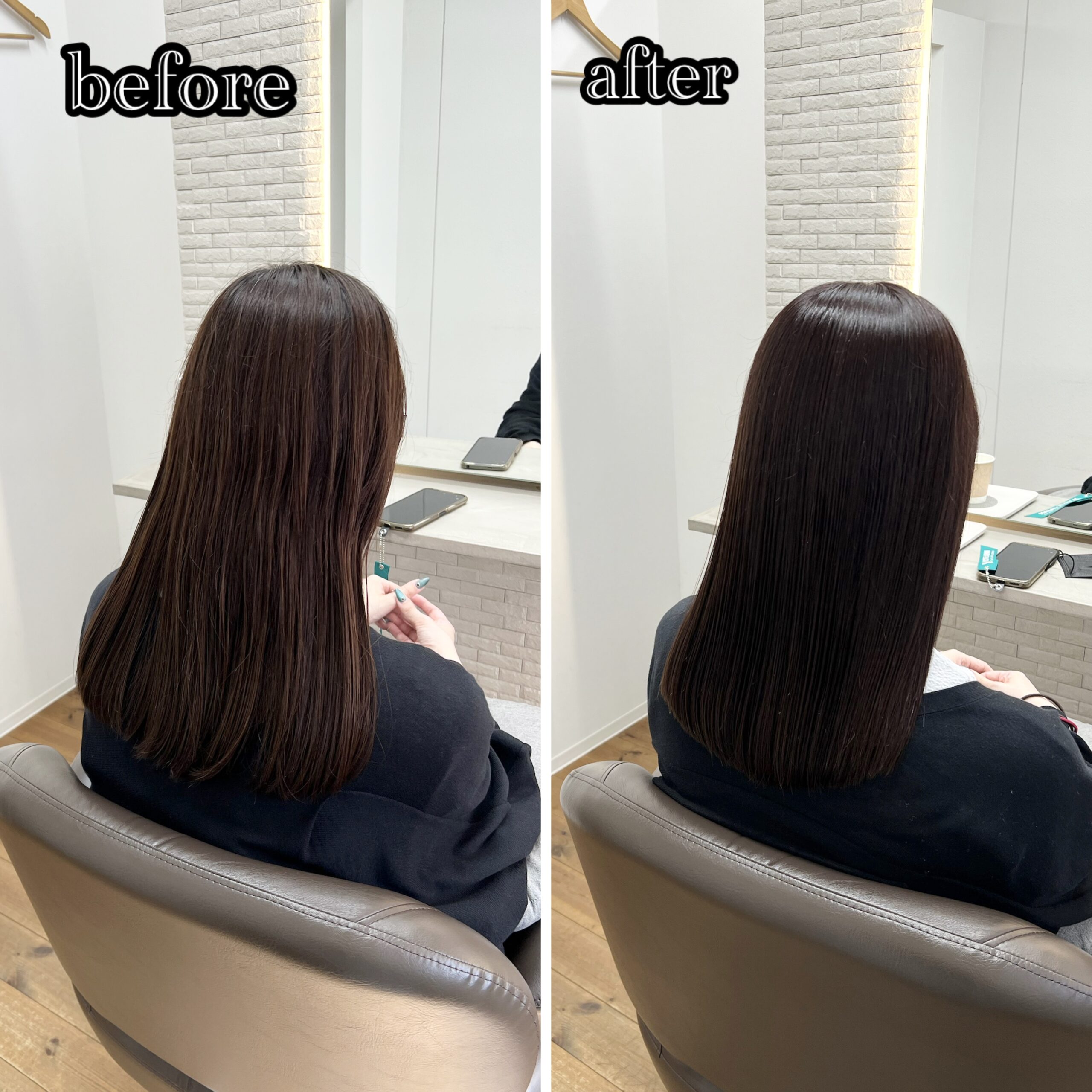 万代店のカラーエステの施術実績 カラーエステでツヤツヤ dearsniigata 2025年9月28日 こちらのお客様はカラーや 縮毛矯正を繰り返し、 毛先のパサつきやダメージ まとまりがないというのがお悩みでした。 今回の髪の毛の悩みは薬剤の選定ミス、髪の毛の乾燥が重なって起きていました。 そこでディアーズでは優しい薬剤を使用して やさしい施術をさせて頂きました。 髪の毛に栄養をたくさん入れたり、 保湿をしっかりすることで まとまりのあるツヤ髪になりました。 お客様からは 「まとまりが出て嬉しいです」 と喜んで頂けました!