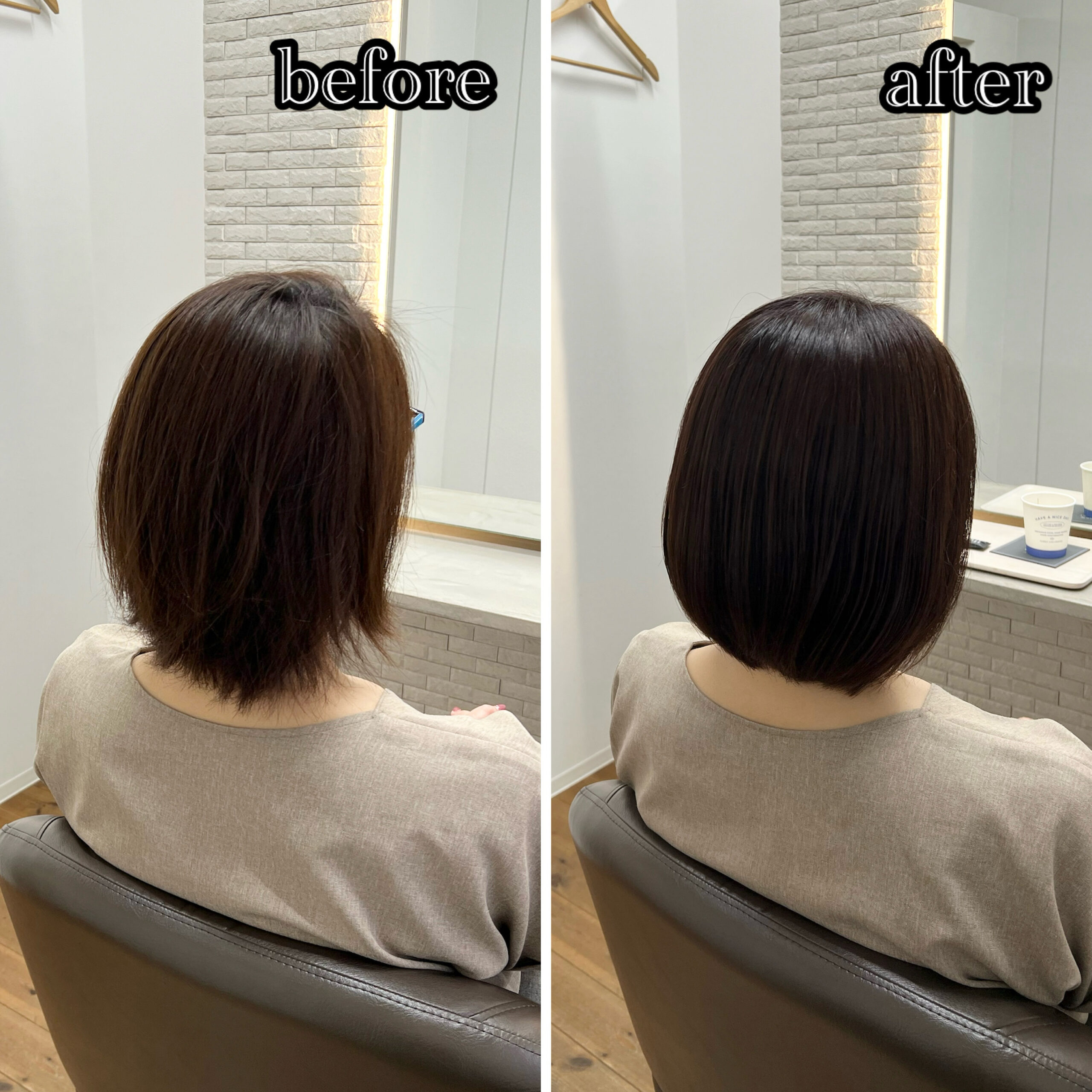 新潟店のブログ カラーエステで落ち着きました dearsniigata 2025年10月10日 こちらのお客様はカラーや 縮毛矯正を繰り返し、 毛先のパサつきやダメージ まとまりがないというのがお悩みでした。 今回の髪の毛の悩みは薬剤の選定ミス、髪の毛の乾燥が重なって起きていました。 そこでディアーズでは優しい薬剤を使用して やさしい施術をさせて頂きました。 髪の毛に栄養をたくさん入れたり、 保湿をしっかりすることで まとまりのあるツヤ髪になりました。 お客様からは 「まとまりが出て嬉しいです」 と喜んで頂けました!