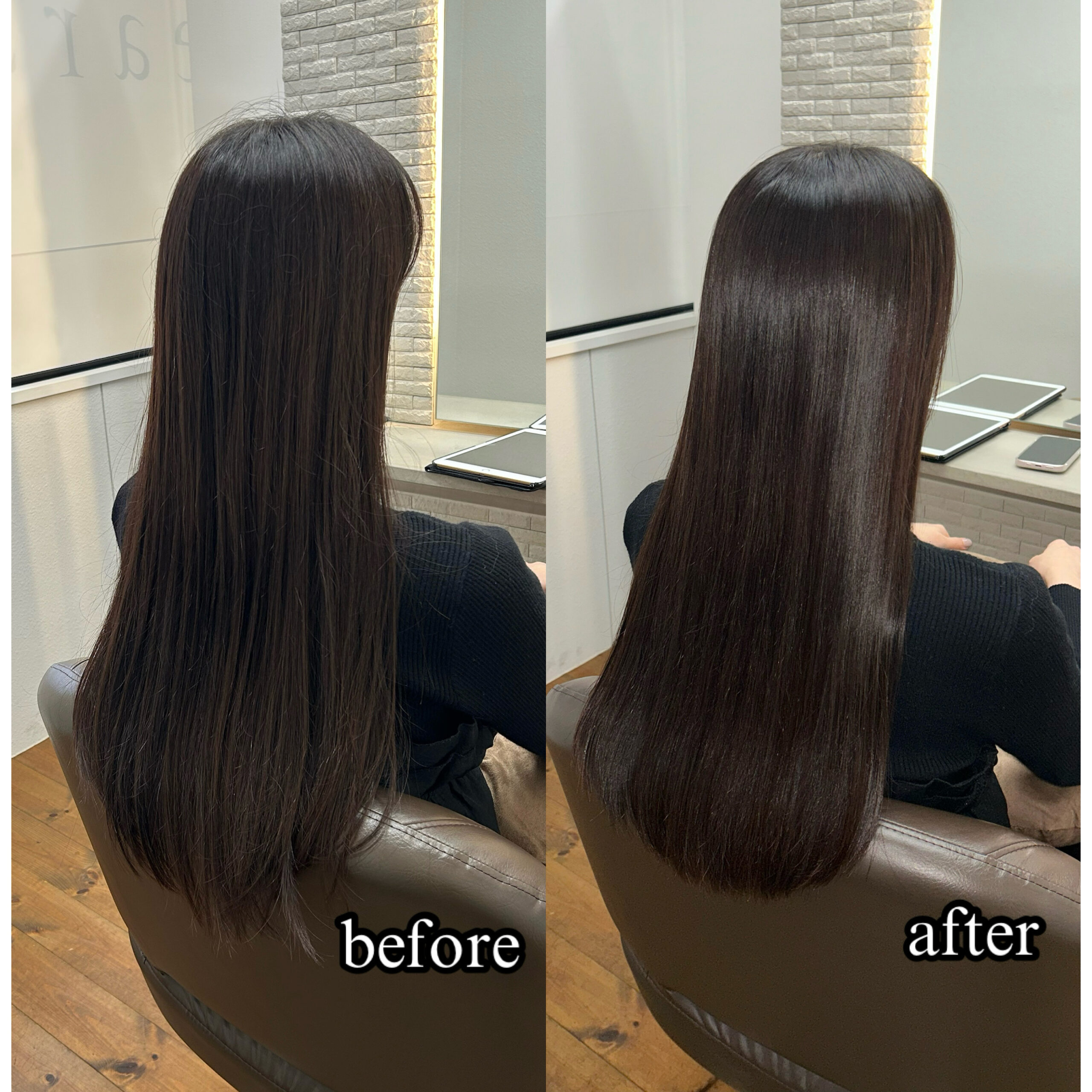 万代店のストレートエステの施術実績 ストレートエステで艶々に dearsniigata 2025年10月30日 こちらのお客様はクセや日々のアイロンによる毛先のパサつきやダメージで絡まり、まとまりがないというのがお悩みでした😭 今回の髪の毛の悩みは薬剤の選定ミス、 髪の毛の乾燥が重なって起きていました。 そこでディアーズでは優しい薬剤を使用して やさしい施術をさせて頂きました❣ 髪の毛に栄養をたくさん入れたり、 保湿をしっかりすることで まとまりのあるサラサラ髪になりました✨ お客様からは 「まとまりもでて嬉しいです💓」 と喜んで頂けました!