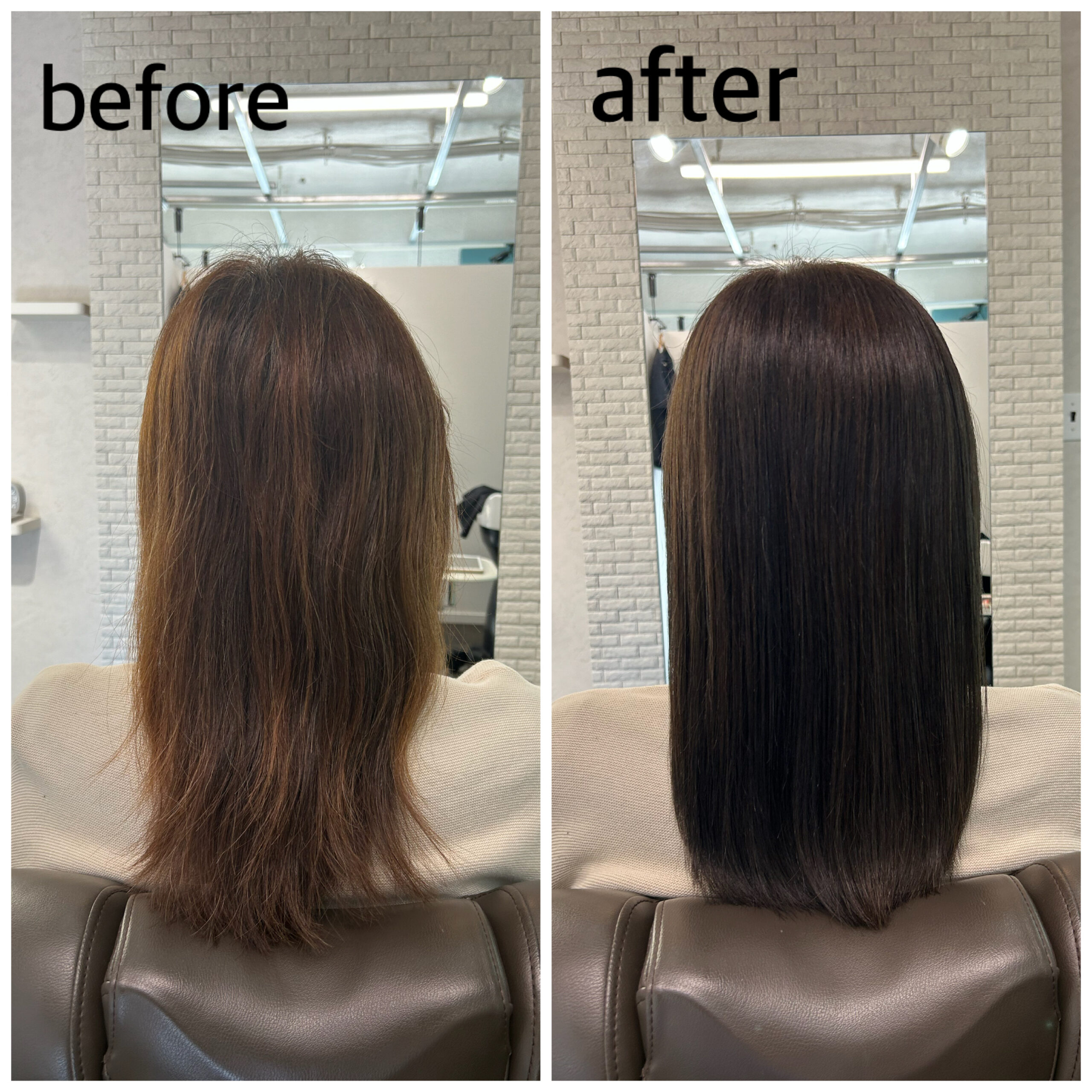 こちらのお客様はカラーや日々のアイロンによる毛先のパサつきやダメージで絡まり、まとまりがないというのがお悩みでした😭