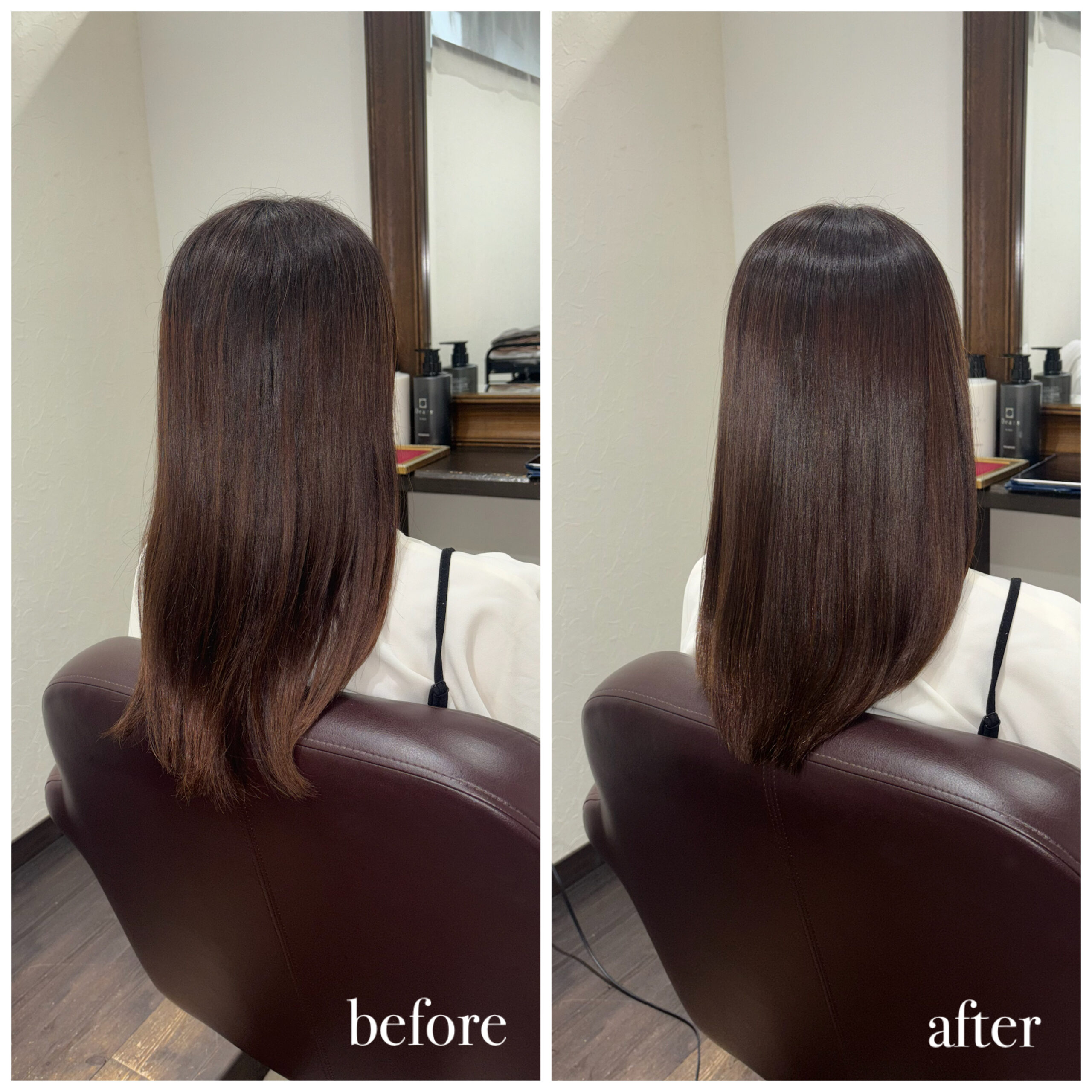 新潟店のストレートエステの施術実績 ストレートエステでツヤツヤに dearsniigata 2025年11月12日 こちらのお客様はカラーや日々のアイロンによる毛先のパサつきやダメージで絡まり、まとまりがないというのがお悩みでした😭 今回の髪の毛の悩みは薬剤の選定ミス、 髪の毛の乾燥が重なって起きていました。 そこでディアーズでは優しい薬剤を使用して やさしい施術をさせて頂きました❣ 髪の毛に栄養をたくさん入れたり、 保湿をしっかりすることで まとまりのあるサラサラ髪になりました✨ お客様からは 「まとまりもでて嬉しいです💓」 と喜んで頂けました!
