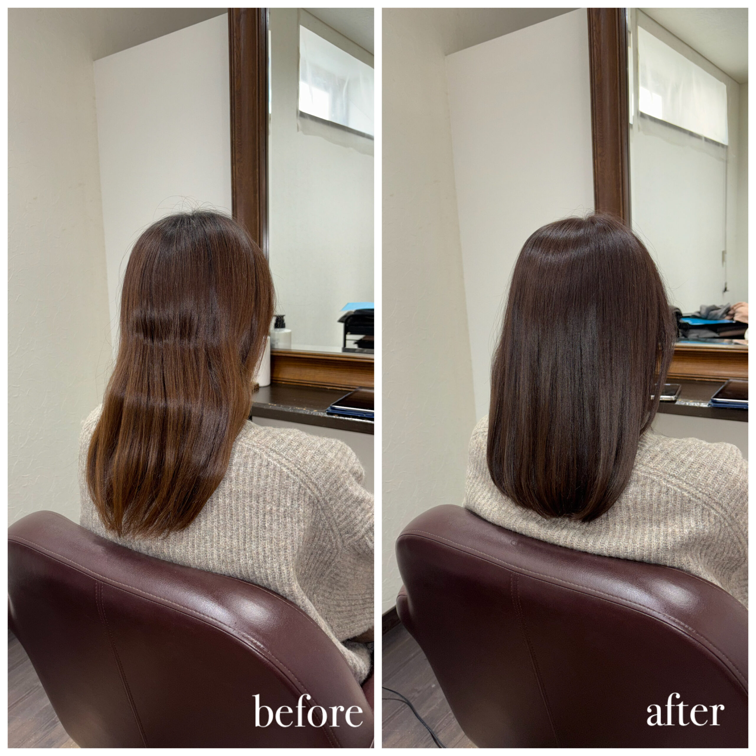 新潟店のカラーエステの施術実績 カラーエステでツヤツヤに dearsniigata 2025年11月22日 こちらのお客様はカラーや日々のアイロンによる毛先のパサつきやダメージで絡まり、まとまりがないというのがお悩みでした😭 今回の髪の毛の悩みは薬剤の選定ミス、 髪の毛の乾燥が重なって起きていました。 そこでディアーズでは優しい薬剤を使用して やさしい施術をさせて頂きました❣ 髪の毛に栄養をたくさん入れたり、 保湿をしっかりすることで まとまりのあるサラサラ髪になりました✨ お客様からは 「まとまりもでて嬉しいです💓」 と喜んで頂けました!