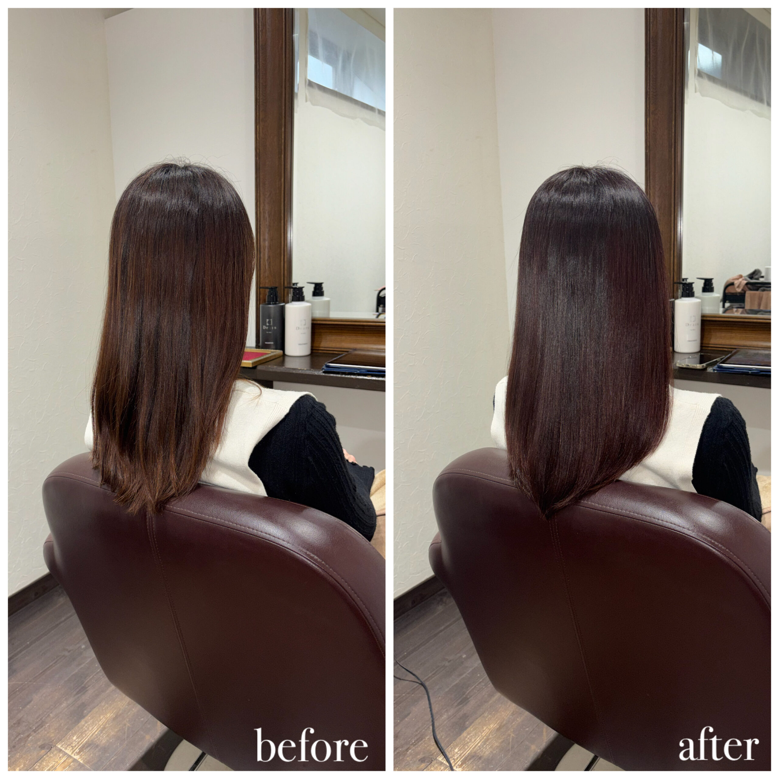 新潟店のカラーエステの施術実績 カラーエステで潤いのある髪へ dearsniigata 2026年1月14日 ここに文字を入力してください こちらのお客様はカラーや日々のアイロンによる毛先のパサつきやダメージで絡まり、まとまりがないというのがお悩みでした😭 今回の髪の毛の悩みは薬剤の選定ミス、 髪の毛の乾燥が重なって起きていました。 そこでディアーズでは優しい薬剤を使用して やさしい施術をさせて頂きました❣ 髪の毛に栄養をたくさん入れたり、 保湿をしっかりすることで まとまりのあるサラサラ髪になりました✨ お客様からは 「まとまりもでて嬉しいです💓」 と喜んで頂けました!